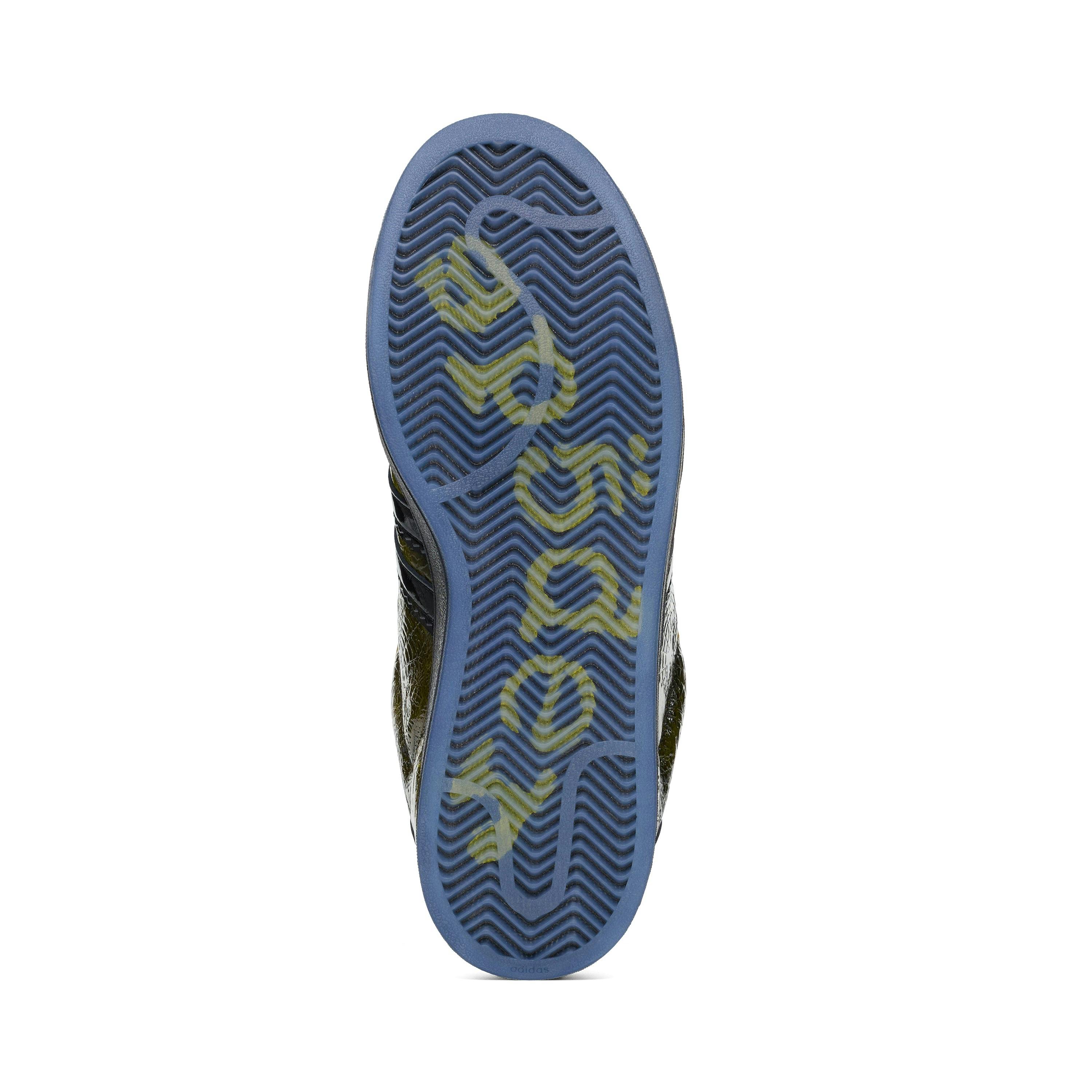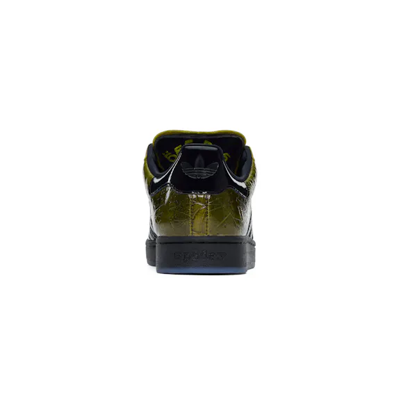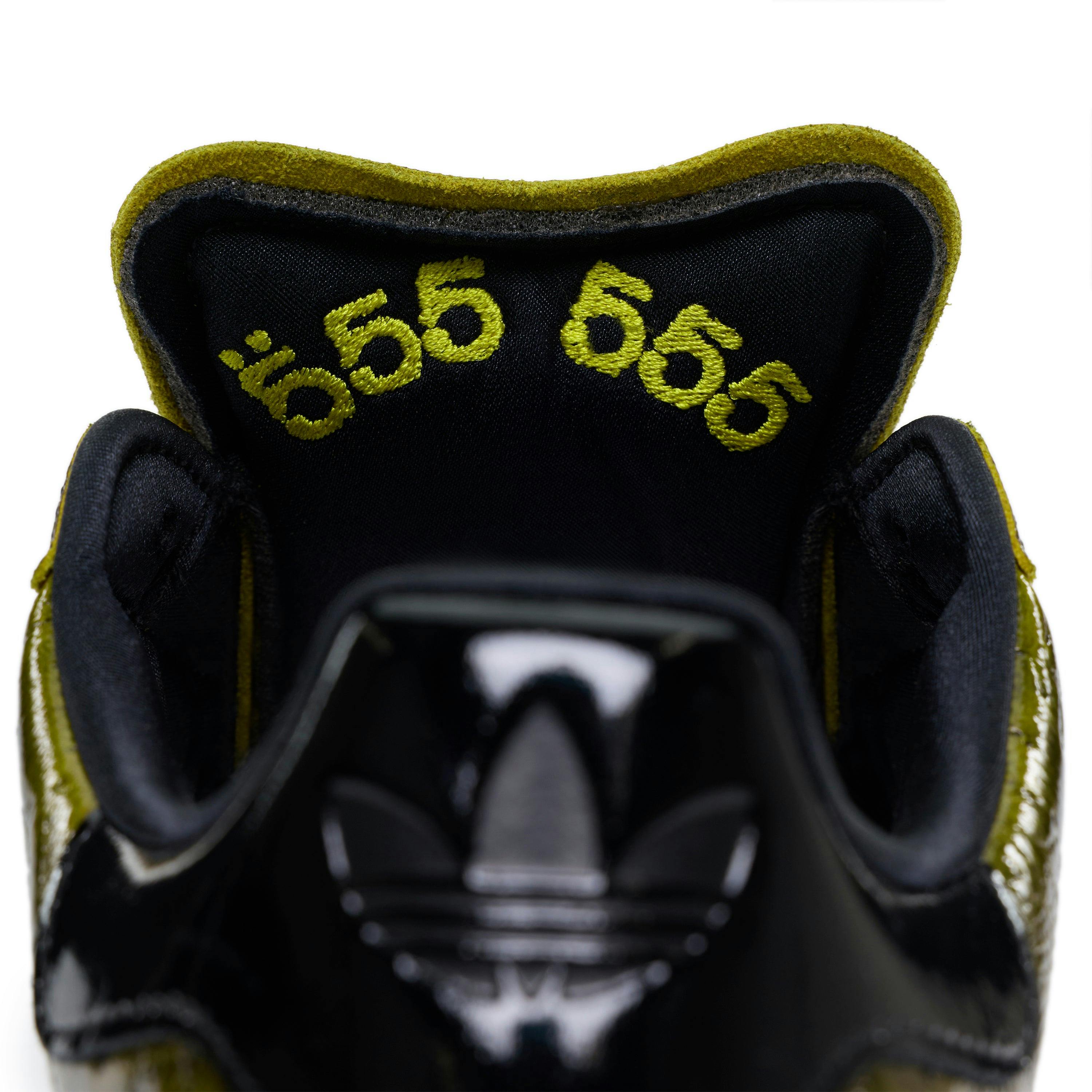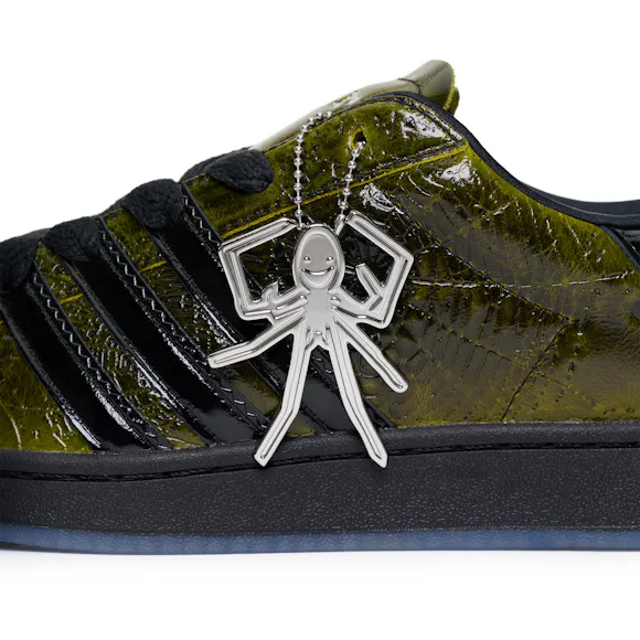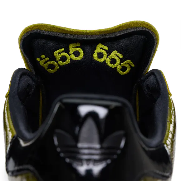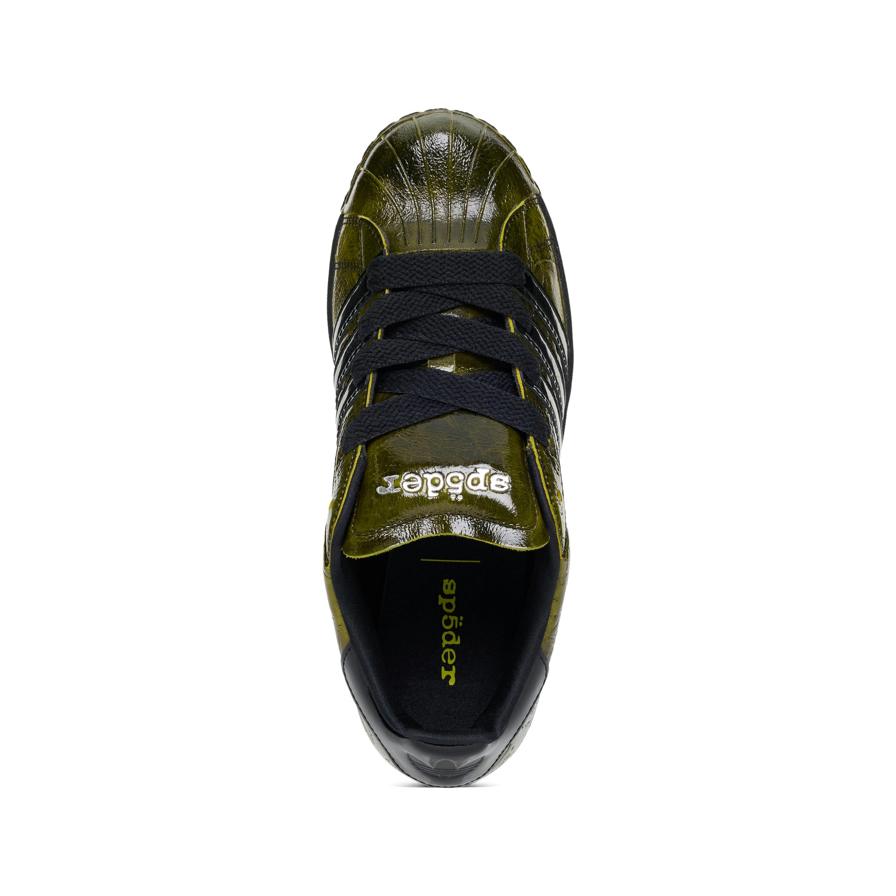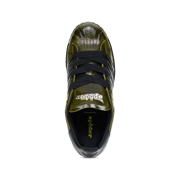 Glossy cracked patent leather upper. Lace-up closure with flat woven laces. Spider charm. Embroidered “555” detail at padded tongue lining. Logo embossed at tongue. Signature serrated stripes in patent finish at sides. Perforated detailing at quarter panels. Padded collar. Textured rubber midsole. Translucent treaded rubber outsole with tonal graphic detailing. Extra laces included.